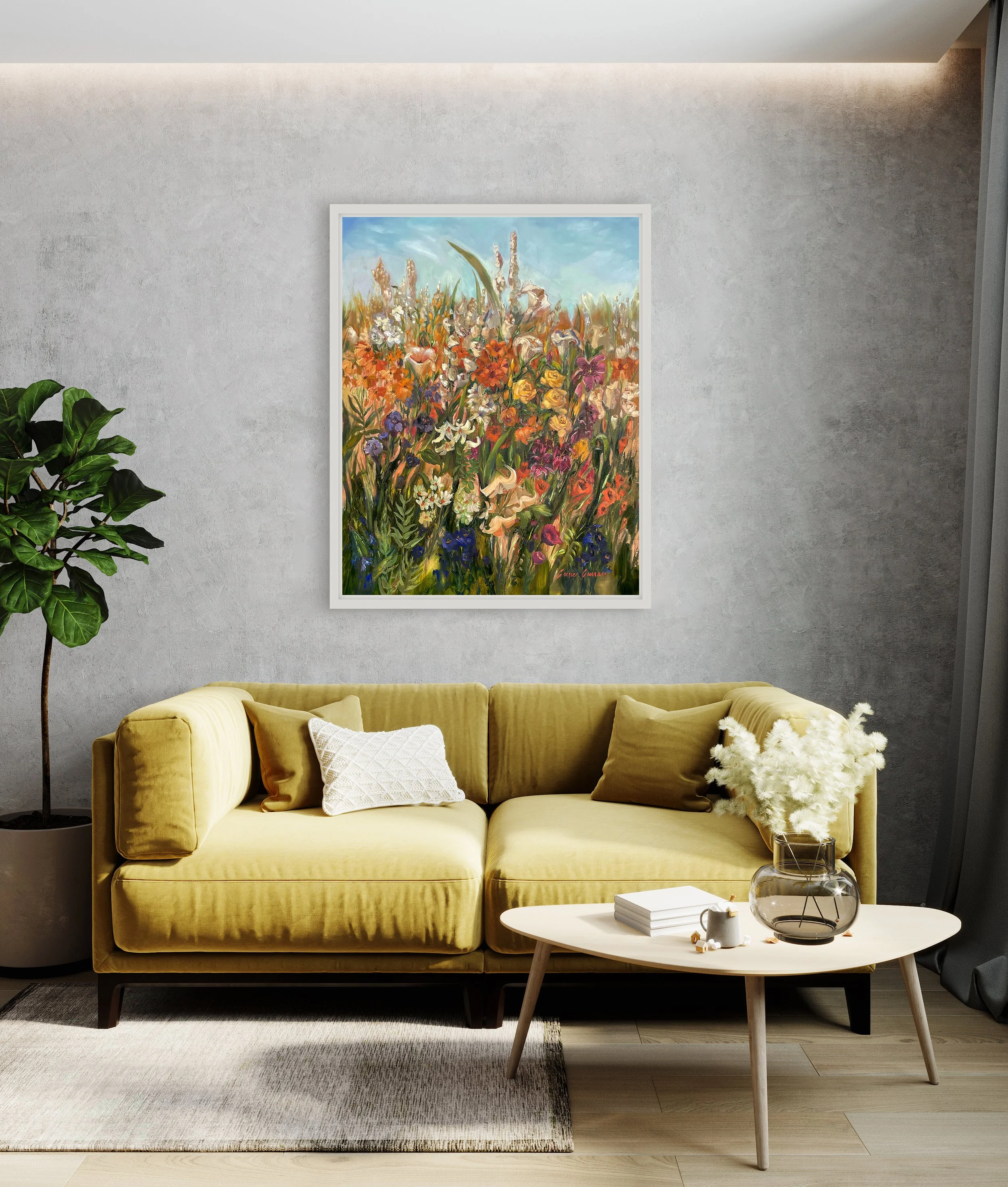 “This is one of a series of large florals I have painted over the years. While painting these, I typically draw on my childhood experience of spending time outdoors in fields of flowers.” - Carrie, Field of Souls.